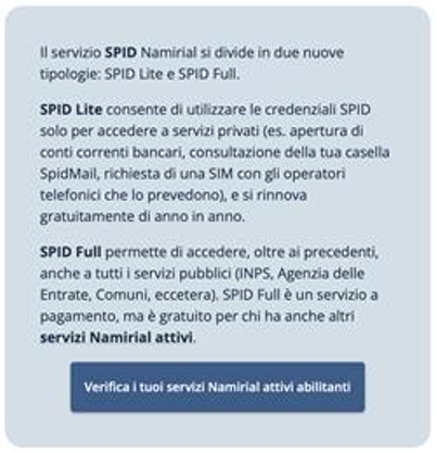 Entro 90 giorni dalla scadenza del tuo SPID, in questa sezione, troverai sulla destra la funzionalità per verificare se hai attivo uno dei servizi abilitanti: clicca su Verifica i tuoi servizi Namirial attivi abilitanti.